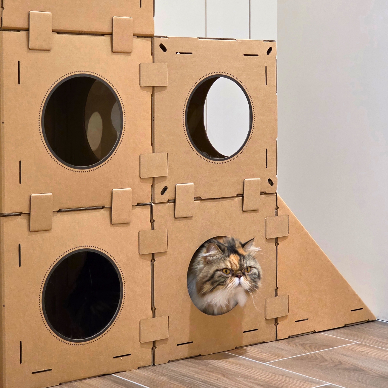 內部設置了7~10塊不等的層板,讓貓居民長期待在此處也不會感到無聊!除了玩樂的空間外,每間也設置了兩個安心方塊屋,貓居民能在裡面放心地休息、躲藏。高處也有設置半圓罩,讓他們能在玩樂同時也能觀看人類在做什麼,以滿足他們的好奇心及不忘本的統治心!