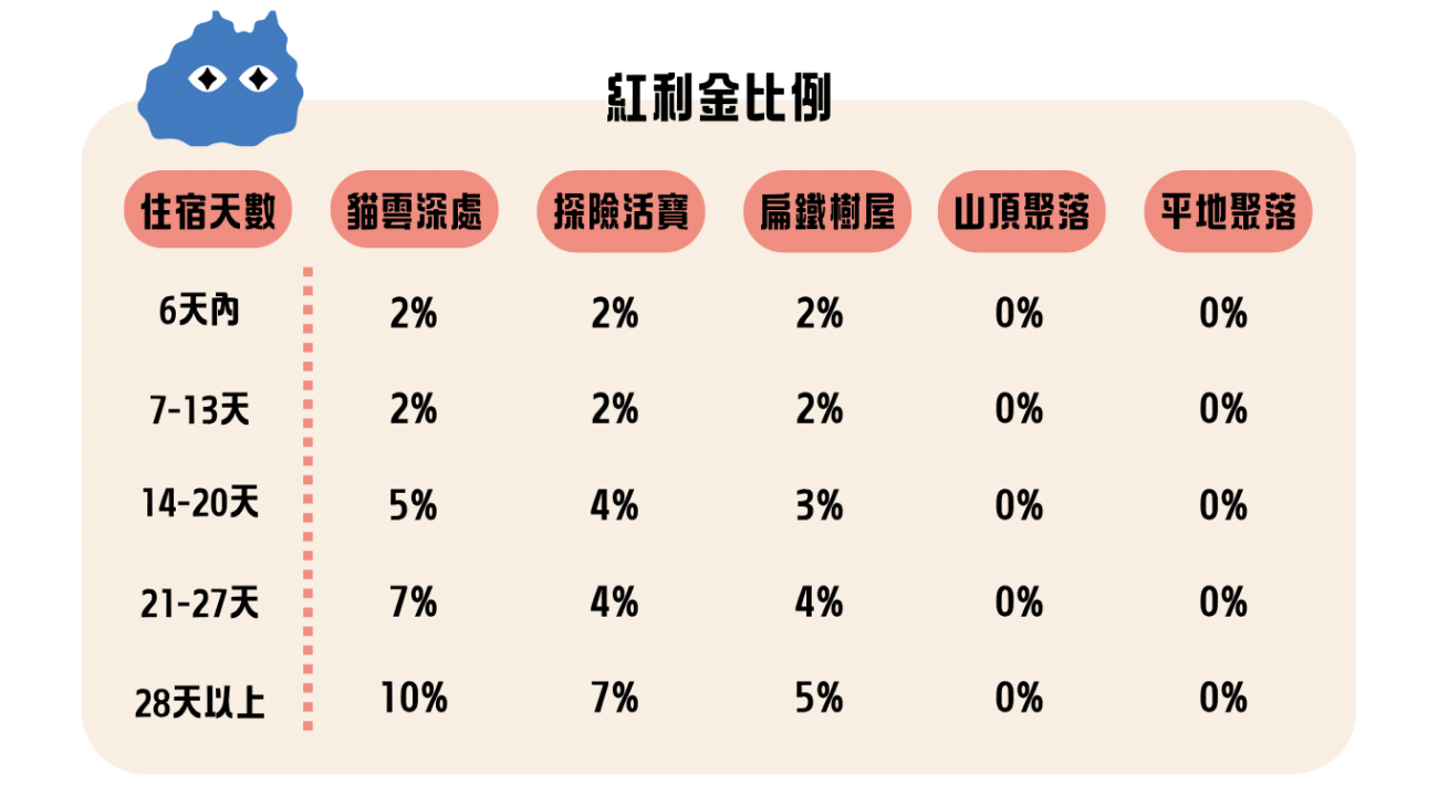 - 紅利金比例依「住宿總金額 × 對應百分比」計算,尾數四捨五入至整數。